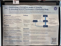 私は「Constructing a Conceptual Model of Empathy in Attending General Practitioners: A Qualitative Study」というタイトルで研究内容を発表しました。ポスター発表は今回が初めての経験であり、準備段階ではポスター1枚に研究内容をまとめることに苦戦しました。本研究はインタビューの内容を質的に分析する手法をとったため、研究結果は主に言葉で記述されました。そのため、ポスターに記載する語句と口頭で説明する内容を選別しながら制作することが難しいと感じました。また、ポスターが文字で溢れたものにならないように、視覚的な工夫が必要でした。こうした作業を通じて、研究の意義や伝え方に関する検討ができたことは、よい経験になったと感じました。当日は、聴き手の反応を間近で見ながら説明することに緊張しました。発表後には研究結果に対するコメントをいただくことができ、嬉しく感じました。基礎医学セミナーや国内学会での発表では手法に関連した質問が多かったため、結果・考察に目を向けたコメントをいただけたことは新鮮で、研究の意義を見直す機会になりました。