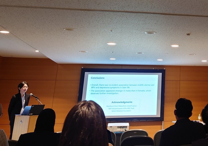 名古屋大学医学部医学科では3年次後期に約半年間の研究室配属期間がありますが、私は学生研究会や国際連携室の支援のもと、「基礎医学セミナー海外派遣留学プログラム」として米国のJohns Hopkins Bloomberg School of Public HealthにVisiting medical studentとして滞在する機会をいただきました。約4か月間のプログラムでは、米国の代表的な長期追跡コホート研究であるARIC研究 (Atherosclerosis Risk in Communities Study) のデータ解析に携わり、その成果を“Blood Pressure Variability in Midlife and Depressive Symptoms in Late Life: the ARIC Study”と題して今回の学会で口頭発表しました。当日の質疑応答では、研究手法の詳細や結果の解釈について新たな視点を得ることができ、論文化に向けて検討を加える点がより明確になったと感じています。