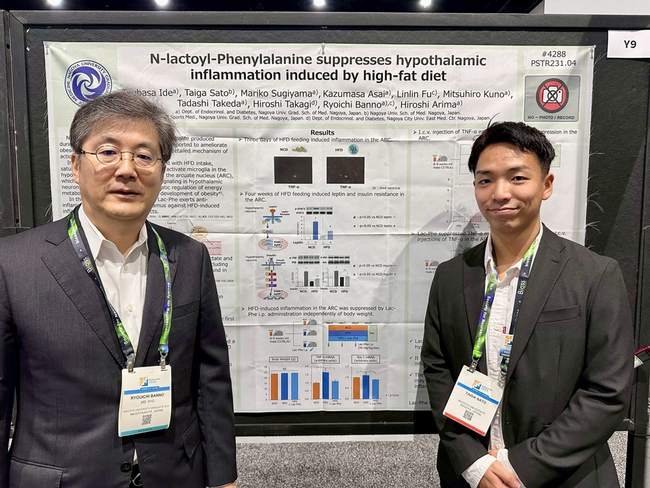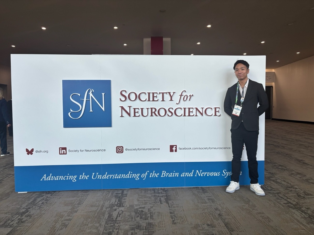 基礎医学セミナー優秀賞受賞者への海外渡航補助を受け、所属研究室で行なった研究について北米神経科学学会(SFN)にてポスター発表をさせていただきました。今回、私は基礎医学セミナーで発表した「N-lactoyl-Phenylalanine(Lac-Phe)が高脂肪食摂取によって誘発される視床下部炎症を抑制する」というテーマで発表を行いました。5時間程度ポスターのところに来てくださった研究者の方々へ研究内容について英語で説明するという形式で、脳神経の分野を研究している方々が大勢訪れてくださり説明と質疑応答を繰り返していくことで大変貴重な経験となりました。